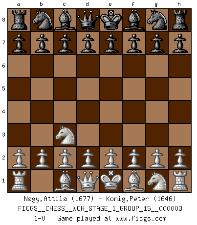 Last move : 1-0 2007 August 10 21:3:22 [Event "FICGS__CHESS__WCH_STAGE_1_GROUP_15__000003"] [Site "FICGS"] [Date "2007.07.11"] [Round "1"] [White "Nagy,Attila"] [Black "Konig,Peter"] [Result "1-0"] [WhiteElo "1677"] [BlackElo "1646"] 1.Nc3 1-0 This chess game has been lost on time (started : 2007.07.11 17:17:11) Dunst (Sleipner, Heinrichsen) Opening Player White won this chess game. Follow this game move after move (download)After black's reply to 1.e4 with 1..e5, leaves him always trying to get into the game. (Howard Staunton) Habe Mut, dich deines eigenen Verstandes zu bedienen. (Immanuel Kant) ¿Que sería del Ajedrez sin errores graciosos?. (Kurt Richter) On entre au jeu d'Echecs comme on entre en Religion. Pour le joueur d'Echecs, la partie d'Echecs c'est l'office, la messe, le défilé du 1er Mai, le dépôt de gerbe au Monument aux Morts. C'est un drame sacré. (Michel Roos) To err is human, to shift the blame on someone else is tactical. (Mladen Jankovic)