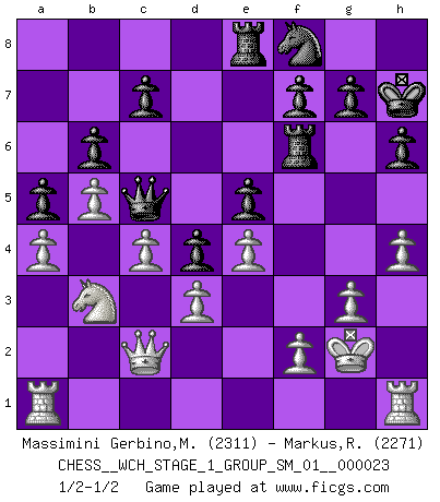 Last move : 1/2-1/2 2021 January 16 21:38:57 [Event "FICGS__CHESS__WCH_STAGE_1_GROUP_SM_01__000023"] [Site "FICGS"] [Date "2020.11.05"] [Round "1"] [White "Massimini Gerbino,Massimiliano"] [Black "Markus,Roland"] [Result "1/2-1/2"] [WhiteElo "2311"] [BlackElo "2271"] 1.e4 e5 2.Nf3 Nc6 3.Bc4 Bc5 4.O-O Nf6 5.d3 d6 6.c3 a6 7.a4 O-O 8.Re1 Ba7 9.h3 h6 10.Nbd2 Re8 11.b4 Be6 12.Bxe6 Rxe6 13.Qc2 Qd7 14.Nf1 d5 15.Be3 Bxe3 16.Nxe3 Rae8 17.b5 Ne7 18.Reb1 Ng6 19.c4 d4 20.Nf5 Ra8 21.Qc1 Kh7 22.g3 Ne7 23.N5h4 Qe8 24.Nd2 Nd7 25.Qc2 Ng6 26.Nhf3 Qe7 27.Kg2 a5 28.Rc1 b6 29.h4 Nc5 30.Nb3 Nf8 31.Nxc5 Qxc5 32.Nd2 Rf6 33.Rh1 Re8 34.Nb3 1/2-1/2 Giuoco Piano Kingside Castling by player White (move 4) Kingside Castling by player Black (move 7) This chess game ended in a draw. Follow this game move after move (download)I guess a certain amount of temperament is expected of Chess geniuses. (Ron Gross) Das Schachspiel übertrifft alle anderen Spiele so weit wie der Chimborasso einen Misthaufen. (Arthur Schopenhauer) Tu sabes, camarada Pachman, no disfruto el ser un Ministro, preferería jugar al Ajedrez como tu. (Che Guevara) Tous ces prétendus hommes politiques sont les pions, les Cavaliers, les Tours ou les Fous d'une partie d'échecs qui se jouera tant qu'un hasard ne renversera pas l'échiquier. (Honoré de Balzac) Control your own destiny or someone else will. (Jack Welch)