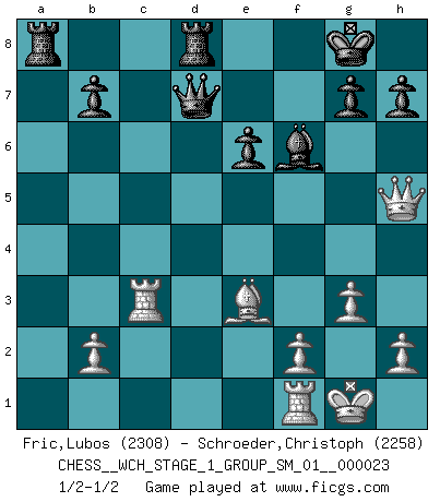 Last move : 1/2-1/2 2021 January 29 21:10:53 [Event "FICGS__CHESS__WCH_STAGE_1_GROUP_SM_01__000023"] [Site "FICGS"] [Date "2020.11.05"] [Round "1"] [White "Fric,Lubos"] [Black "Schroeder,Christoph"] [Result "1/2-1/2"] [WhiteElo "2308"] [BlackElo "2258"] 1.e4 e6 2.d4 d5 3.Nc3 dxe4 4.Nxe4 Nd7 5.Nf3 Ngf6 6.Nxf6+ Nxf6 7.c3 c5 8.Be3 Qc7 9.Ne5 a6 10.Qa4+ Nd7 11.Bb5 cxd4 12.Bxd7+ Bxd7 13.Qxd4 Bb5 14.a4 Bd6 15.Nxf7 Kxf7 16.axb5 axb5 17.Rd1 Rhd8 18.Qh4 b4 19.Rc1 bxc3 20.Rxc3 Qd7 21.O-O Kg8 22.Qh5 Be7 23.g3 Bf6 1/2-1/2 French : Rubinstein variation Kingside Castling by player White (move 21) This chess game ended in a draw. Follow this game move after move (download)You know you're going to lose. Even when I was ahead I knew I was going to lose. - On playing against Fischer. (Andrew Soltis) Ja, ich habe einmal eine Blitzpartie gespielt, es war in einem Zug, 1929. --im Interview 1989 (Mikhail Moiseyevich Botvinik) La vida es como el Ajedrez, con lucha, competición y eventos buenos y malos. (Benjamin Franklin) Vous m'avez demandé de vous exposer quel est le fondement de la prière. Je ne fais que préparer les pièces du jeu sur la table... Nous sera-t-il permis d'en adopter les règles et si nous les appliquons scrupuleusement nous ne tarderons pas à faire mat le Roi divin ! Il ne pourra échapper à nos mains. (Sainte Thérèse d'Avila, Chemin de perfection) Always remember that you are unique; just like everyone else. (Unknown)