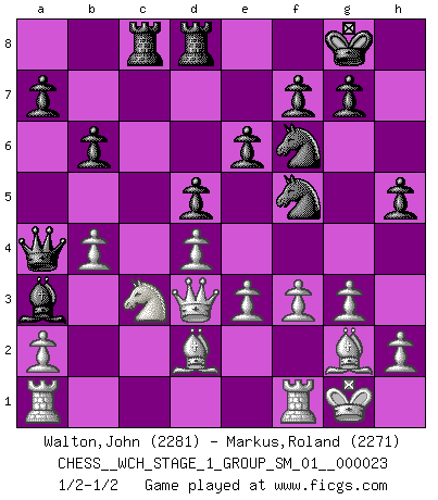 Last move : 1/2-1/2 2020 December 8 7:10:7 [Event "FICGS__CHESS__WCH_STAGE_1_GROUP_SM_01__000023"] [Site "FICGS"] [Date "2020.11.05"] [Round "1"] [White "Walton,John"] [Black "Markus,Roland"] [Result "1/2-1/2"] [WhiteElo "2281"] [BlackElo "2271"] 1.d4 Nf6 2.c4 e6 3.g3 d5 4.Nf3 Bb4+ 5.Bd2 Be7 6.Bg2 O-O 7.O-O c6 8.Qc2 Nbd7 9.Bf4 b6 10.Rd1 Bb7 11.Ne5 Nh5 12.Bd2 Nhf6 13.cxd5 cxd5 14.Nc6 Bxc6 15.Qxc6 Rc8 16.Qb5 Ne8 17.Qd3 Nd6 18.Nc3 Nf6 19.b3 Qd7 20.f3 Nf5 21.e3 Rfd8 22.Ne2 h5 23.Rf1 Ba3 24.b4 Qa4 25.Nc3 Qd7 26.Ne2 Qa4 27.Nc3 1/2-1/2 Catalan Opening Kingside Castling by player Black (move 6) Kingside Castling by player White (move 7) This chess game ended in a draw. Follow this game move after move (download)Chess is a terrific way for kids to build self image and self esteem. (Saudin Robovic) Stelle das Brett so, daß die Sonne in die Augen deines Gegners scheint. (Ruy López) Nunca antes ha habido un jugador de Ajedrez con tal conocimiento a fondo de las complejidades del juego y una inmensa voluntad absolutamente indomable de ganar. Yo pienso que Fischer es el jugador mas grande que jamás haya existido. (Lisa Lane) Aux échecs, les retours au sommet sont rares : les dommages psychologiques consécutifs à une défaite sont trop sévères. (Daily Telegraph) Cactus - It is depressed cucumber. (Ilmars Cirulis)
