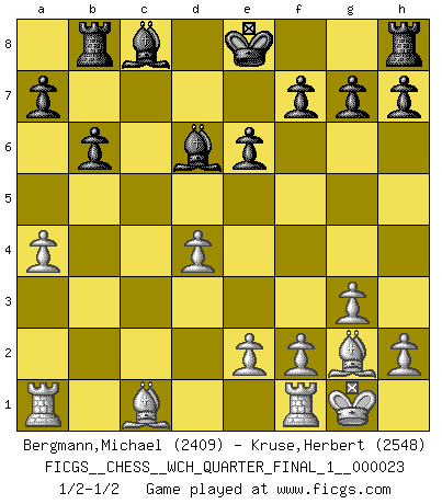 Last move : 1/2-1/2 2020 November 8 15:17:33 [Event "FICGS__CHESS__WCH_QUARTER_FINAL_1__000023"] [Site "FICGS"] [Date "2020.11.05"] [Round "4"] [White "Bergmann,Michael"] [Black "Kruse,Herbert"] [Result "1/2-1/2"] [WhiteElo "2409"] [BlackElo "2548"] 1.Nf3 Nf6 2.c4 c5 3.Nc3 Nc6 4.g3 d5 5.d4 e6 6.cxd5 Nxd5 7.Bg2 cxd4 8.Nxd4 Nxc3 9.bxc3 Nxd4 10.Qxd4 Qxd4 11.cxd4 Bd6 12.O-O Rb8 13.a4 b6 1/2-1/2 Reti Opening Kingside Castling by player White (move 12) This chess game ended in a draw. Follow this game move after move (download)Why must I lose to this idiot ? (Aron Nimzovich) Man wirke der falschen Auffassung entgegen, als ob jeder Zug Unmittelbares zu leisten habe; auch Werte- und Ruhezüge haben ihre Existenzberechtigung. (Aaron Nimzowitsch) La vida es como un juego de Ajedrez, cambiando con cada movimiento. (Proverbio Chino) Psychologiquement, tu dois avoir confiance en toi même, mais cette confiance doit être basée sur des faits. (Robert Fischer) Do you know these so called Volunteers don't even get paid! (Simpsons)