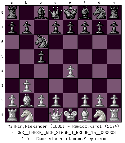 Last move : 1-0 2007 August 13 3:26:47 [Event "FICGS__CHESS__WCH_STAGE_1_GROUP_15__000003"] [Site "FICGS"] [Date "2007.07.11"] [Round "1"] [White "Minkin,Alexander"] [Black "Rawicz,Karol"] [Result "1-0"] [WhiteElo "1882"] [BlackElo "2174"] 1.e4 c5 2.b3 Nc6 3.Bb2 1-0 This chess game has been lost on time (started : 2007.07.11 17:17:11) Sicilian defense Player White won this chess game. Follow this game move after move (download)Fischer sacrificed virtually everything most of us weakies (to use his term) value, respect, and cherish, for the sake of an artful, often beautiful board game, for the ambivalent privilege of being its greatest master. (Paul Kollar) Der Bart als Geschlechtszeichen mitten im Gesicht ist obszön. Daher gefällt er den Weibern. [Zugegeben, kein Schachzitat, aber unglaublich originell] (Arthur Schopenhauer) Con el tiempo, empecé a progresar en partidas decisivas. Tal vez porque me di cuenta de una simple verdad: no solo estaba yo nervioso sino también mi oponente. (Mikhail Tal) La vie est comme un jeu d'échecs : nous esquissons un plan, mais celui-ci est tributaire de ce que daignent faire l'adversaire aux échecs et le destin dans la vie. (Arthur Schopenhauer) Control your own destiny or someone else will. (Jack Welch)