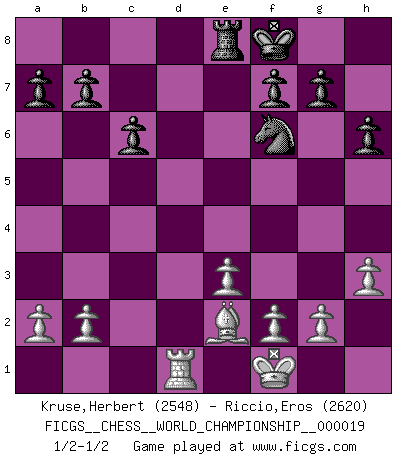 Last move : 1/2-1/2 2021 January 17 11:15:6 [Event "FICGS__CHESS__WORLD_CHAMPIONSHIP__000019"] [Site "FICGS"] [Date "2020.11.06"] [Round "8"] [White "Kruse,Herbert"] [Black "Riccio,Eros"] [Result "1/2-1/2"] [WhiteElo "2548"] [BlackElo "2620"] 1.c4 e6 2.d4 d5 3.Nc3 Nf6 4.Bg5 Be7 5.e3 O-O 6.Nf3 h6 7.Bxf6 Bxf6 8.Rc1 c6 9.Be2 Nd7 10.O-O dxc4 11.Bxc4 e5 12.Ne4 exd4 13.Nxf6+ Nxf6 14.Qxd4 Bg4 15.Qf4 Re8 16.Rfd1 Qe7 17.h3 Bxf3 18.Qxf3 Rad8 19.Qf4 Kf8 20.Be2 Ne4 21.Rxd8 Qxd8 22.Rd1 Qf6 23.Qxf6 Nxf6 24.Kf1 1/2-1/2 English Opening Kingside Castling by player Black (move 5) Kingside Castling by player White (move 10) This chess game ended in a draw. Follow this game move after move (download)Nowadays, when you're not a grandmaster at 14, you can forget about it. (Anand Viswanathan) Obwohl ich alt bin, darf mir niemand den Finger in den Mund stecken, sonst beisse ich. (Wilhelm Steinitz) Debemos de asegurarnos de que el Ajedrez no se convierta en un lenguaje muerto, muy interesante, pero solo para un grupo muy pequeño. (Sytze Faber) On n'a jamais que l'âge auquel on a commence à jouer aux échecs car après on cesse de vieillir. (Capablanca) I think your argument is specious - I think your tie is ugly. (Gregory House to Dr. Foreman, House M.D.)