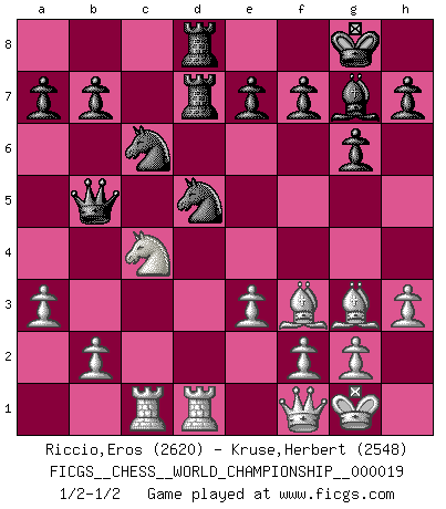 Last move : 1/2-1/2 2021 February 1 12:38:40 [Event "FICGS__CHESS__WORLD_CHAMPIONSHIP__000019"] [Site "FICGS"] [Date "2020.11.06"] [Round "9"] [White "Riccio,Eros"] [Black "Kruse,Herbert"] [Result "1/2-1/2"] [WhiteElo "2620"] [BlackElo "2548"] 1.d4 Nf6 2.Nf3 d5 3.Bf4 c5 4.e3 Nc6 5.Nbd2 Qb6 6.dxc5 Qxc5 7.a3 Bg4 8.Be2 g6 9.h3 Bxf3 10.Bxf3 Bg7 11.c4 dxc4 12.Rc1 Qb5 13.Nxc4 Rd8 14.Qe2 O-O 15.O-O Nd5 16.Bg3 Rd7 17.Rfd1 Rfd8 18.Qf1 1/2-1/2 Queen's pawn game Kingside Castling by player Black (move 14) Kingside Castling by player White (move 15) This chess game ended in a draw. Follow this game move after move (download)In order to improve your game, you must study the endgame before everything else, for whereas the endings can be studied and mastered by themselves, the middle game and the opening must be studied in relation to the endgame. (Jose Raul Capablanca) Wenn es im Universum noch irgendwo intelligente Lebewesen gibt, dann kennen sie Go. (Emanuel Lasker) El muchacho (en ese entonces un niño de 12 años llamado Anatoly Karpov) no tiene ni idea de lo que es el Ajedrez y no hay futuro en absoluto para el en esta profesión. (Mikhail Botvinnik) Mais l'homme est une créature légère et illogique : semblable au joueur d'échecs, il n'aime que le processus du but à atteindre, non le but lui-même. (Dostoïevsky) No man has ever achieved immortality in his own life time. (Unknown)