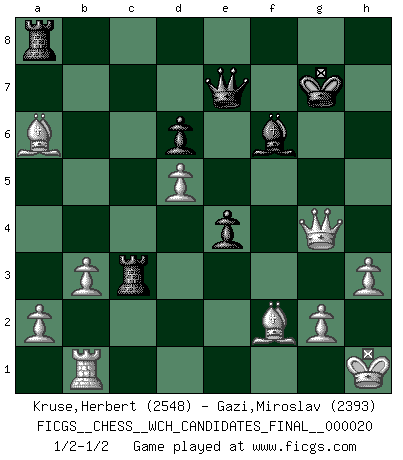 Last move : 1/2-1/2 2021 March 16 7:3:48 [Event "FICGS__CHESS__WCH_CANDIDATES_FINAL__000020"] [Site "FICGS"] [Date "2020.11.06"] [Round "1"] [White "Kruse,Herbert"] [Black "Gazi,Miroslav"] [Result "1/2-1/2"] [WhiteElo "2548"] [BlackElo "2393"] 1.e4 c5 2.Nc3 d6 3.Nge2 Nf6 4.d4 cxd4 5.Nxd4 a6 6.Be3 e5 7.Nb3 Be6 8.f3 h5 9.Nd5 Bxd5 10.exd5 Nbd7 11.Qd2 g6 12.Be2 Bg7 13.O-O b6 14.Rad1 O-O 15.Kh1 b5 16.Na5 Nb6 17.c4 Nxc4 18.Nxc4 bxc4 19.Bxc4 Re8 20.h3 Qe7 21.Rb1 Rec8 22.b3 e4 23.f4 h4 24.Be2 Rc7 25.f5 Rac8 26.fxg6 fxg6 27.Qd1 Kh7 28.Rf4 Rc3 29.Rxh4+ Nh5 30.Bf2 Bf6 31.Rxh5+ gxh5 32.Bxa6 Ra8 33.Qxh5+ Kg7 34.Qg4+ 1/2-1/2 Sicilian : Closed Kingside Castling by player White (move 13) Kingside Castling by player Black (move 14) This chess game ended in a draw. Follow this game move after move (download)Man is a frivolous, a specious creature, and like a Chess player, cares more for the process of attaining his goal than for the goal itself. (Dostoyevsky) Wenn Dein Gegner dir ein Remis anbietet, versuch herauszufinden, weshalb er glaubt schlechter zu stehen. (Nigel Short) El Ajedrez es el arte del análisis. (Mikhail Botvinnik) A ce moment-là, je menaçais de comprendre la position ! (Clément L'Heureux) Programming can only do so much before it becomes too much. (Don Groves)