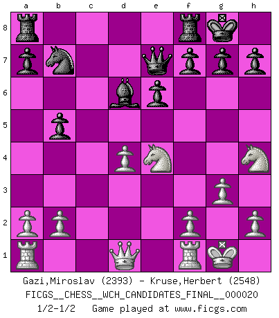 Last move : 1/2-1/2 2020 December 27 17:35:38 [Event "FICGS__CHESS__WCH_CANDIDATES_FINAL__000020"] [Site "FICGS"] [Date "2020.11.06"] [Round "6"] [White "Gazi,Miroslav"] [Black "Kruse,Herbert"] [Result "1/2-1/2"] [WhiteElo "2393"] [BlackElo "2548"] 1.d4 Nf6 2.Nf3 e6 3.g3 b5 4.Bg2 Bb7 5.Bg5 c5 6.Bxf6 Qxf6 7.c3 d5 8.Nbd2 Nd7 9.O-O Bd6 10.e4 dxe4 11.Nh4 cxd4 12.Bxe4 Nc5 13.Bxb7 Nxb7 14.Ne4 Qe7 15.cxd4 O-O 1/2-1/2 Queen's pawn game Kingside Castling by player White (move 9) Kingside Castling by player Black (move 15) This chess game ended in a draw. Follow this game move after move (download)A Chess game is divided into three stages: the first, when you hope you have the advantage, the second when you believe you have an advantage, and the third... when you know you're going to lose ! (Savielly Tartakower) Ich verachte die Medien. (Robert James Fischer) Los libros de Ajedrez deben de usarse igual como usamos los anteojos: para mejorar la vista, aunque algunos jugadores los quieren usar como si ellos les otorgaran la vision. (José Raúl Capablanca) Pour se monter efficace, un Cavalier a besoin d'avant-postes ! Les Cavaliers font les meilleurs bloqueurs de pions passés. There is no vagueness without wind. (Chinese proverb)