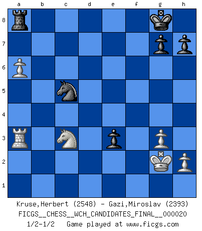 Last move : 1/2-1/2 2021 March 21 10:20:38 [Event "FICGS__CHESS__WCH_CANDIDATES_FINAL__000020"] [Site "FICGS"] [Date "2020.11.06"] [Round "7"] [White "Kruse,Herbert"] [Black "Gazi,Miroslav"] [Result "1/2-1/2"] [WhiteElo "2548"] [BlackElo "2393"] 1.e4 c5 2.Nf3 d6 3.d4 cxd4 4.Nxd4 Nf6 5.f3 e5 6.Nb3 Be6 7.c4 Nbd7 8.Nc3 Rc8 9.Be3 Bxc4 10.Bxc4 Rxc4 11.Qd3 Rc8 12.Bxa7 b6 13.O-O Be7 14.a4 d5 15.exd5 Bb4 16.Nb5 O-O 17.Rac1 Nc5 18.Nxc5 Bxc5+ 19.Kh1 Qxd5 20.Qxd5 Nxd5 21.Rfd1 Rcd8 22.Rb1 f5 23.a5 Be3 24.b4 e4 25.fxe4 fxe4 26.g3 bxa5 27.Bxe3 Nxe3 28.Rxd8 Rxd8 29.bxa5 Nc2 30.Rc1 Nb4 31.Rc4 e3 32.Nc3 Nd3 33.Kg2 Rf8 34.a6 Ra8 35.Ra4 Nc5 36.Ra3 1/2-1/2 Sicilian : Prins (Moscow) variation Kingside Castling by player White (move 13) Kingside Castling by player Black (move 16) This chess game ended in a draw. Follow this game move after move (download)Those who say they understand Chess, understand nothing. (Robert Hubner) Schach ist ein Kampf gegen den Fehler. (Johannes Herrman Zukertort) Es muy difícil jugar en contra de la teoría de Einstein. - en su primera derrota en contra de Fischer (Mikhail Tal) Avant la finale, les dieux ont créé le milieu de partie. (Tarrasch) Are you threatening me, Master Jedi ? (Chancellor Palpatine in Star Wars ep.3)