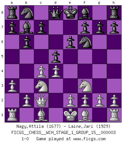 Last move : 1-0 2007 August 17 15:28:1 [Event "FICGS__CHESS__WCH_STAGE_1_GROUP_15__000003"] [Site "FICGS"] [Date "2007.07.11"] [Round "1"] [White "Nagy,Attila"] [Black "Laine,Jari"] [Result "1-0"] [WhiteElo "1677"] [BlackElo "1929"] 1.d4 e6 2.c4 b6 3.Nf3 Bb7 4.Nc3 Nf6 5.a3 d5 6.Qc2 1-0 Queen's pawn : Keres defense Player White won this chess game. Follow this game move after move (download)A Chess game is divided into three stages: the first, when you hope you have the advantage, the second when you believe you have an advantage, and the third... when you know you're going to lose ! (Savielly Tartakower) Man braucht nicht immer den besten Zug zu spielen: Ein Zug muß aktiv, unternehmungslustig, korrekt und schön sein. (David Bronstein) ¿Esta Bobby Fischer algo cuerdo?. (Salo Flohr) Karpov est une pièce de musée. (Garry Kasparov) Bobby never cared about money, though. His only desire was to prove that his choices were correct: He wanted chess to be important because he was a chess player, and he wanted to be important. Bobby knew money was important, but he didn't have a clue why, outside of clothes and status. The only way he could accomplish what he wanted was to fight for a lot of money. Once he got it, he gave it away. He did not know how to spend it. And once he'd become champion, after, essentially, sacrificing his life for it, he didn't know how to spend his time. (Bob Wade)