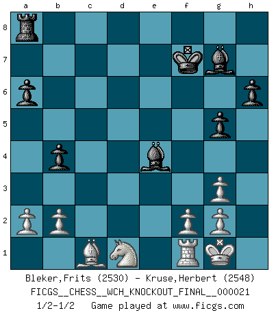 Last move : 1/2-1/2 2021 January 5 12:52:54 [Event "FICGS__CHESS__WCH_KNOCKOUT_FINAL__000021"] [Site "FICGS"] [Date "2020.11.06"] [Round "2"] [White "Bleker,Frits"] [Black "Kruse,Herbert"] [Result "1/2-1/2"] [WhiteElo "2530"] [BlackElo "2548"] 1.d4 Nf6 2.c4 c6 3.Nf3 d5 4.Nc3 e6 5.Bg5 h6 6.Bh4 dxc4 7.e4 g5 8.Bg3 b5 9.Be2 Bb7 10.O-O Nbd7 11.Ne5 Bg7 12.Nxd7 Nxd7 13.Bd6 a6 14.e5 c5 15.d5 Nxe5 16.dxe6 Nd3 17.exf7+ Kxf7 18.Bxd3 cxd3 19.Qxd3 Qf6 20.Qg3 Rhd8 21.Bxc5 Qc6 22.Be3 b4 23.Nd1 Rd3 24.Rc1 Qxc1 25.Bxc1 Rxg3 26.hxg3 Be4 1/2-1/2 Queen's pawn game Kingside Castling by player White (move 10) This chess game ended in a draw. Follow this game move after move (download)Different people feel differently about resigning. (Bobby Fischer) Wie, soll nun auch die Opposition abgeschafft werden? Ja, es tut mir leid, Ihnen diesen Schmerz nicht ersparen zu können. (Aaron Nimzowitsch) Solo el jugador con la iniciativa tiene el derecho a atacar. (Wilhelm Steinitz) La solitude du joueur d'Echecs à l'approche du mat est semblable à celle du condamné. (Francis Szpiner) Creativity is allowing yourself to make mistakes. Art is knowing which ones to keep. (Scott Adams)
