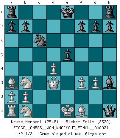 Last move : 1/2-1/2 2020 November 28 18:11:30 [Event "FICGS__CHESS__WCH_KNOCKOUT_FINAL__000021"] [Site "FICGS"] [Date "2020.11.06"] [Round "5"] [White "Kruse,Herbert"] [Black "Bleker,Frits"] [Result "1/2-1/2"] [WhiteElo "2548"] [BlackElo "2530"] 1.Nf3 c5 2.e4 d6 3.d4 cxd4 4.Nxd4 Nf6 5.f3 e5 6.Nb3 d5 7.Bg5 d4 8.c3 Nc6 9.cxd4 Bb4+ 10.Bd2 Nxe4 11.Bxb4 Qh4+ 12.g3 Nxg3 13.hxg3 Qxh1 14.Ba3 Bh3 15.Qd3 1/2-1/2 Reti Opening This chess game ended in a draw. Follow this game move after move (download)Chess, like love, like music, has the power to make people happy. (Siegbert Tarrasch) Die Leute spielen gegen mich seit 15 Jahren unter Ihren Möglichkeiten. (Robert James Fischer) El Ajedrez es imaginación. (David Bronstein) Les échecs, c'est l'art d'analyser. (Mikhail Botvinnik) The difference between stupidity and genius is that genius has its limits. (Murphy)