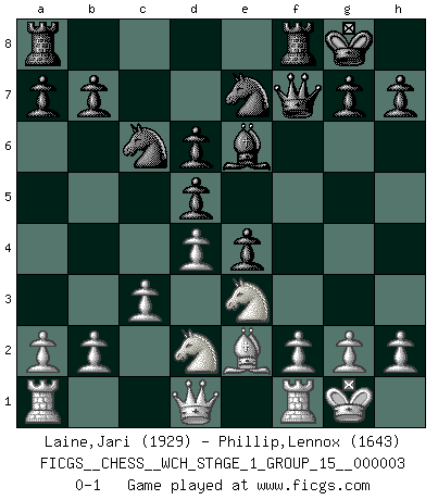 Last move : 0-1 2007 August 17 15:28:55 [Event "FICGS__CHESS__WCH_STAGE_1_GROUP_15__000003"] [Site "FICGS"] [Date "2007.07.11"] [Round "1"] [White "Laine,Jari"] [Black "Phillip,Lennox"] [Result "0-1"] [WhiteElo "1929"] [BlackElo "1643"] 1.e4 e5 2.Nf3 Nc6 3.c3 f5 4.d4 fxe4 5.Nxe5 Qf6 6.Ng4 Qg6 7.Bf4 d5 8.Ne3 Qf7 9.Bg3 Bd6 10.Bxd6 cxd6 11.Nd2 Nge7 12.Be2 O-O 13.O-O Be6 0-1 Ponziani counter-gambit Kingside Castling by player Black (move 12) Kingside Castling by player White (move 13) Player Black won this chess game. Follow this game move after move (download)Half the variations which are calculated in a tournament game turn out to be completely superfluous. Unfortunately, no one knows in advance which half. (Jan Tinman) Über Kasparov: Es ist offensichtlich, daß er in einem totalitären Staat aufwuchs und deshalb zu diktatorischen Zügen neigt. (Viktor Kortschnoi) El Ajedrez no es como la vida... ¡tiene reglas!. (Mark Pasternak) La vie et les Echecs sont tous les deux une lutte constante. (Lasker) Ah, the Socrating method. The best way we have of teaching everything-apart from juggling chainsaws. (Gregory House, House M.D.)