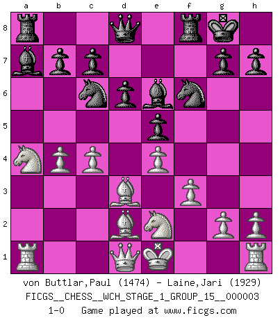Last move : 1-0 2007 August 17 15:30:33 [Event "FICGS__CHESS__WCH_STAGE_1_GROUP_15__000003"] [Site "FICGS"] [Date "2007.07.11"] [Round "1"] [White "von Buttlar,Paul"] [Black "Laine,Jari"] [Result "1-0"] [WhiteElo "1474"] [BlackElo "1929"] 1.c4 f5 2.e4 fxe4 3.d3 Nf6 4.Nc3 e5 5.dxe4 Bc5 6.f3 d6 7.Bd3 O-O 8.Nge2 Be6 9.a3 a5 10.Na4 Ba7 11.b4 axb4 12.axb4 Nc6 13.Bd2 1-0 English : Anglo-Dutch defense Kingside Castling by player Black (move 7) Player White won this chess game. Follow this game move after move (download)I don't believe in psychology. I believe in good moves. (Bobby Fischer) Ich suche im Schach immer etwas Eigenes. Riskantes Spiel im Stile schachlicher Musketiere ist nicht meine Sache, auch wenn es vielen Freunden scharfer Wendungen gefällt. (Anatoly Karpov) ¿Que sería del Ajedrez sin errores graciosos?. (Kurt Richter) Les Echecs représentent une sphère d'idées créatrices basée sur la volonté des deux protagonistes. (Smyslov) Hold em is to stud what chess is to checkers. (Johnny Moss)