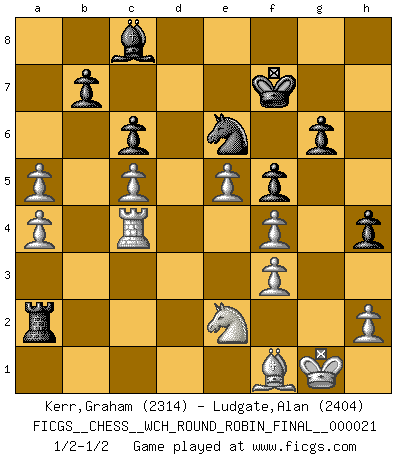 Last move : 1/2-1/2 2021 February 8 4:49:2 [Event "FICGS__CHESS__WCH_ROUND_ROBIN_FINAL__000021"] [Site "FICGS"] [Date "2020.11.06"] [Round "1"] [White "Kerr,Graham"] [Black "Ludgate,Alan"] [Result "1/2-1/2"] [WhiteElo "2314"] [BlackElo "2404"] 1.d4 Nf6 2.c4 g6 3.Nc3 Bg7 4.g3 O-O 5.Bg2 d6 6.Nf3 Nbd7 7.O-O e5 8.e4 exd4 9.Nxd4 Re8 10.Qc2 Nc5 11.Rd1 Qe7 12.Bg5 c6 13.Rd2 h6 14.Bf4 Nfd7 15.b3 Bxd4 16.Rxd4 Ne6 17.Rd3 Nxf4 18.gxf4 Nc5 19.Rg3 h5 20.Rd1 h4 21.Re3 Bg4 22.f3 Be6 23.Bf1 Rad8 24.Qd2 Qf6 25.Ne2 Kh7 26.Kh1 Bd7 27.b4 Ne6 28.Qc3 Qxc3 29.Rxc3 a5 30.bxa5 Nc5 31.Rxd6 Bc8 32.Rd4 Ne6 33.Rxd8 Rxd8 34.Kg1 Rd2 35.a3 Kg7 36.c5 Kf6 37.a4 Kg7 38.Rc4 f5 39.e5 Kf7 40.Kf2 Ra2 41.Kg1 Rd2 42.Kf2 Ra2 43.Kg1 1/2-1/2 King's Indian defense, 3.Nc3 Kingside Castling by player Black (move 4) Kingside Castling by player White (move 7) This chess game ended in a draw. Follow this game move after move (download)What is the difference between chess and football? Everybody understands football, but nobody plays it. Everybody plays chess, but nobody understands it. Everything is relative. (Vladimir Kramnik) Capablanka war das größte Genie der Schachgeschichte! Aber denken sie nicht er habe nichts vom Schach verstanden. Er wusste nur soviel wie er wissen musste um seine Ziele zu erreichen. (Mikhail Moiseyevich Botvinik) Del Ajedrez se ha dicho que la vida no es lo suficientemente larga para él, pero eso es culpa de la vida, no del Ajedrez. (William Ewart Napier) Roi des jeux et jeu des rois, les échecs portent en eux un sentiment d'infini. Ils donnent à celui qui s'est efforcé d'en approfondir les arcanes l'impression de n'être pas à la mesure de l'homme; en fait, ils constituent un résumé de l'univers, un microcosme, et figurent cette grande échelle qui, dans les plans de la lumière descend jusqu'à la matière, qui des abîmes insondables remonte jusqu'en l'infini de Dieu. (Pyrame) A proverb is a short sentence based on long experience. (Miguel de Cervantes)