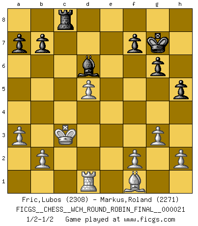 Last move : 1/2-1/2 2021 February 19 13:40:49 [Event "FICGS__CHESS__WCH_ROUND_ROBIN_FINAL__000021"] [Site "FICGS"] [Date "2020.11.06"] [Round "1"] [White "Fric,Lubos"] [Black "Markus,Roland"] [Result "1/2-1/2"] [WhiteElo "2308"] [BlackElo "2271"] 1.e4 e5 2.Nf3 Nf6 3.Nxe5 d6 4.Nf3 Nxe4 5.Nc3 Nxc3 6.dxc3 Be7 7.Be3 O-O 8.Qd2 Nd7 9.O-O-O c6 10.c4 Nf6 11.Bd3 d5 12.Rhe1 Re8 13.Bd4 h6 14.cxd5 Nxd5 15.c4 c5 16.Bxc5 Bxc5 17.Rxe8+ Qxe8 18.cxd5 Bg4 19.Qf4 Bxf3 20.Qxf3 Qe5 21.g3 g6 22.Bc4 Bd6 23.Bf1 Re8 24.a3 h5 25.Kc2 Kg7 26.Qc3 Qxc3+ 27.Kxc3 Rc8+ 1/2-1/2 Petrov : Nimzovich attack Kingside Castling by player Black (move 7) Queenside Castling by player White (move 9) This chess game ended in a draw. Follow this game move after move (download)Any material change in a position must come about by mate, a capture, or a Pawn promotion. (Purdy) Die Jungen erwarten, dass Opa einfach umfällt. Dann aber kann Opa fünf Stunden lang Schach spielen und die jungen Gegner an die Wand drücken. (Viktor Kortschnoi) Morphy probablemente fue el genio más grande de todos. (Bobby Fischer) Il vaut toujours mieux jouer un plan faux de façon logique que de n'avoir pas de plan du tout. (Victor Kortchnoï) The absolute truth is the thing that makes people laugh. (Carl Reiner)