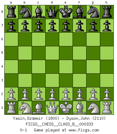 Last move : 0-1 2020 December 17 12:5:15 [Event "FICGS__CHESS__CLASS_B__000333"] [Site "FICGS"] [Date "2020.11.07"] [Round "1"] [White "Yasin,Ozdemir"] [Black "Dyson,John"] [Result "0-1"] [WhiteElo "1800"] [BlackElo "2110"] 0-1 This chess game has been lost on time (started : 2020.11.07 10:15:54) Player Black won this chess game. Follow this game move after move (download)In Chess, as it is played by masters, chance is practically eliminated. (Emanuel Lasker) Aljechin war kein Nazi. Er war ein Opportunist. Ein schrecklicher Mann. Er liebte Geld über alles und würde für Geld ein Jude, ein Katolik oder ein Protestant werden. (Miguel Najdorf) El Ajedrez es 99 por ciento táctica. (Teichmann) Le succès, c'est être capable d'aller d'échec en échec sans perdre son enthousiasme. (Winston Churchill) Art disturbs, science reassures. (Georges Braque, Le Jour et la Nuit)