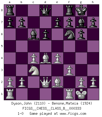Last move : 1-0 2021 March 2 15:10:7 [Event "FICGS__CHESS__CLASS_B__000333"] [Site "FICGS"] [Date "2020.11.07"] [Round "1"] [White "Dyson,John"] [Black "Benone,Mateia"] [Result "1-0"] [WhiteElo "2110"] [BlackElo "1924"] 1.Nf3 c5 2.c4 g6 3.d4 cxd4 4.Nxd4 Nc6 5.e4 Bg7 6.Be3 Nf6 7.Nc3 O-O 8.Be2 d6 9.O-O Bd7 10.Qd2 Nxd4 11.Bxd4 Bc6 12.f3 1-0 This chess game has been lost on time (started : 2020.11.07 10:15:54) Reti Opening Kingside Castling by player Black (move 7) Kingside Castling by player White (move 9) Player White won this chess game. Follow this game move after move (download)A win by an unsound combination, however showy, fills me with artistic horror. (Wilhelm Steinitz) Modernes Schach sorgt sich zuviel um Dinge wie Bauernstruktur usw. Vergessen Sie das, Schachmatt beendet das Spiel! (Nigel Short) Prefiero perder una partida realmente buena, que ganar una mala. (David Levy) A ce moment-là, je menaçais de comprendre la position ! (Clément L'Heureux) Creativity is allowing yourself to make mistakes. Art is knowing which ones to keep. (Scott Adams)