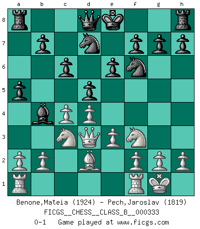 Last move : 0-1 2021 February 8 14:39:18 [Event "FICGS__CHESS__CLASS_B__000333"] [Site "FICGS"] [Date "2020.11.07"] [Round "1"] [White "Benone,Mateia"] [Black "Pech,Jaroslav"] [Result "0-1"] [WhiteElo "1924"] [BlackElo "1819"] 1.Nf3 d5 2.d4 Nf6 3.c4 c6 4.e3 Bf5 5.Bd3 Bxd3 6.Qxd3 e6 7.O-O Nbd7 8.Nc3 Bb4 9.Bd2 a5 0-1 This chess game has been lost on time (started : 2020.11.07 10:15:54) Reti Opening Kingside Castling by player White (move 7) Player Black won this chess game. Follow this game move after move (download)Of all my Russian books, the defense contains and diffuses the greatest 'warmth' which may seem odd seeing how supremely abstract Chess is supposed to be. (Vladimir Nabokov) Schon mancher Spieler hat aufgegeben, um zu vermeiden, daß er eine Figur verliert. (Savielly Grigorievitsch Tartakower) El Ajedrez se juega con la mente... ¡no con las manos!. (Renaud y Kahn) La conception d'un plan est le processus par lequel un joueur exploite les avantages de sa position tout en s'efforçant d'en réduire au minimum les inconvénients. Afin de garantir le succès, un plan doit toujours se fonder sur un diagnostic objectif des particularités d'une position. La conception d'un plan est d'autant plus difficile que la position est équilibrée, et grandement facilitée lorsqu'il n'existe qu'un seul plan susceptible de répondre aux exigences de la position. (Harry Golombek) Hardware: the parts of a computer that can be kicked. (Jeff Persis)