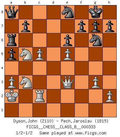 Last move : 1/2-1/2 2021 October 16 11:9:47 [Event "FICGS__CHESS__CLASS_B__000333"] [Site "FICGS"] [Date "2020.11.07"] [Round "1"] [White "Dyson,John"] [Black "Pech,Jaroslav"] [Result "1/2-1/2"] [WhiteElo "2110"] [BlackElo "1819"] 1.Nf3 Nf6 2.c4 c5 3.Nc3 Nc6 4.d4 cxd4 5.Nxd4 e6 6.g3 Qb6 7.Nb3 Ne5 8.e4 Bb4 9.Qe2 d6 10.Bd2 O-O 11.O-O-O Bd7 12.f4 Ng6 13.Bg2 Rfc8 14.e5 Ne8 15.Kb1 Bc6 16.Bxc6 Qxc6 17.Nb5 Bxd2 18.Nxd2 dxe5 19.fxe5 Qc5 20.Rhe1 a6 21.Nc3 Rab8 22.a3 Qc7 23.b4 Ne7 24.Rc1 Rd8 25.Red1 a5 26.b5 Rd4 27.Ka2 Rc8 28.Na4 Rcd8 29.Nb2 Ng6 30.Nf3 Rxd1 31.Nxd1 Nf8 32.Qe3 Ng6 33.Nb2 Rd7 34.Na4 Qd8 35.Rc2 Qb8 36.Nc5 Rc7 37.b6 Rc6 38.Nb3 Qa8 39.Nfd4 Rxb6 40.c5 Ra6 41.Nb5 1/2-1/2 Reti Opening Kingside Castling by player Black (move 10) Queenside Castling by player White (move 11) This chess game ended in a draw. Follow this game move after move (download)Chess problems demand from the composer the same virtues that characterize all worthwhile art: originality, invention, conciseness, harmony, complexity, and splendid insincerity. (Vladimir Nabokov) Im Internet Chess Club betrug mein Rating vorübergehend 3350 ELO-Punkte. (Sergej Karjakin) El Ajedrez es una manera fabulosa para que los niños aprendan a autovalorarse y a autoestimarse. (Saudin Robovic) Même un GMI sait rarement calculer sur plus de cinq coups une attaque à sacrifices. (Rudolf Spielmann) Now be brave and don't look back. Don't look back. (Shmi Skywalker in Star Wars ep.1)