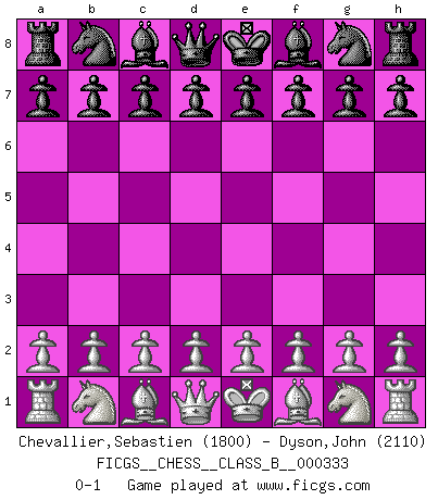 Last move : 0-1 2020 December 17 12:5:15 [Event "FICGS__CHESS__CLASS_B__000333"] [Site "FICGS"] [Date "2020.11.07"] [Round "1"] [White "Chevallier,Sebastien"] [Black "Dyson,John"] [Result "0-1"] [WhiteElo "1800"] [BlackElo "2110"] 0-1 This chess game has been lost on time (started : 2020.11.07 10:15:54) Player Black won this chess game. Follow this game move after move (download)It began to feel as though you were playing against Chess itself. - On playing against Robert Fischer. (Walter Shipman) Weshalb minderdergeübte Spieler mit g2-g4 beginnen? Die betreffenden sind unschlüssig, ob sie nun rechts (h4) oder links (f4) beginnen sollen, und in ihrer Ratlosigkeit entschliessen sie sich nach guter Bürgerart dazu, den goldenen Mittelweg zu wählen. (Aaron Nimzowitsch) Yo he agregado estos principios a la ley: pongan los Caballos en acción antes de que los dos Alfiles sean desarrollados. (Emanuel Lasker) Psychologiquement, tu dois avoir confiance en toi même, mais cette confiance doit être basée sur des faits. (Robert Fischer) Thus, what is of supreme importance in war is to attack the enemy's strategy. (Sun Tzu)