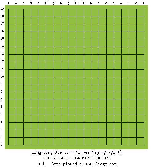 Last move : 0-1 2020 December 10 15:10:40 [Event "FICGS__GO__TOURNAMENT__000073"] [Site "FICGS"] [Date "2020.11.10"] [Round "1"] [Black "Ling,Bing Xue"] [White "Ni Rea,Mayang Ngi"] [Result "0-1"] 0-1 This go game has been lost on time (started : 2020.11.10 13:7:15) Here are the names of the openings (joseki) played in the four corners : Player White won this Go (weiqi, baduk) game. Follow this game move after move (download)One point in the center is worth ten in the corner. (Anonymous) This is where the fun begins. (Anakin Skywalker in Star Wars ep.3)