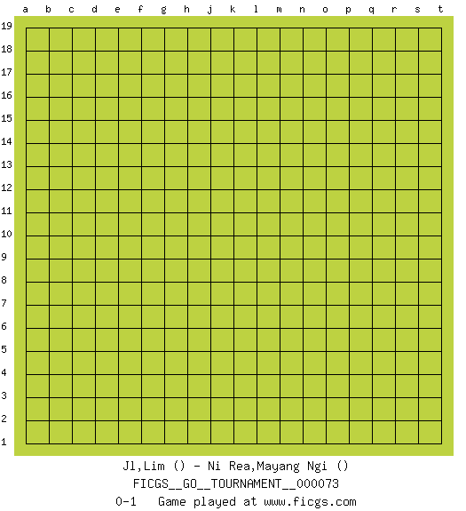 Last move : 0-1 2020 December 10 15:10:40 [Event "FICGS__GO__TOURNAMENT__000073"] [Site "FICGS"] [Date "2020.11.10"] [Round "1"] [Black "Jl,Lim"] [White "Ni Rea,Mayang Ngi"] [Result "0-1"] 0-1 This go game has been lost on time (started : 2020.11.10 13:7:15) Here are the names of the openings (joseki) played in the four corners : Player White won this Go (weiqi, baduk) game. Follow this game move after move (download)Ikken tobi is never wrong. (Anonymous) It is a good thing for an uneducated man to read books of quotations. (Winston Churchill)