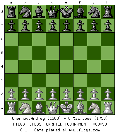 Last move : 0-1 2020 December 23 23:33:44 [Event "FICGS__CHESS__UNRATED_TOURNAMENT__000059"] [Site "FICGS"] [Date "2020.11.13"] [Round "1"] [White "Chernov,Andrey"] [Black "Ortiz,Jose"] [Result "0-1"] [WhiteElo "1588"] [BlackElo "1730"] 0-1 This chess game has been lost on time (started : 2020.11.13 20:7:17) Player Black won this chess game. Follow this game move after move (download)The stomach is an essential part of the Chess master. (Bent Larsen) Deine Wertungszahl - vorausgesetzt einige Jahre schachliche Anstrengung - entspricht etwa dem zehnfachen Deines IQ plus 1000. (Jonathan Levitt) La enorme capacidad mental, en la que sin ella no puede un jugador de Ajedrez existir, es demasiado requerida por el Ajedrez al grado de que nunca podrá liberar su mente de este juego. (Albert Einstein) Des combinaisons [dans le jeu d'échecs] pareilles à des mélodies. Je crois entendre pour ainsi dire la musique des coups... (Vladimir Nabokov) The next best thing to gambling and winning is gambling and loosing. (Nick Dandalos)