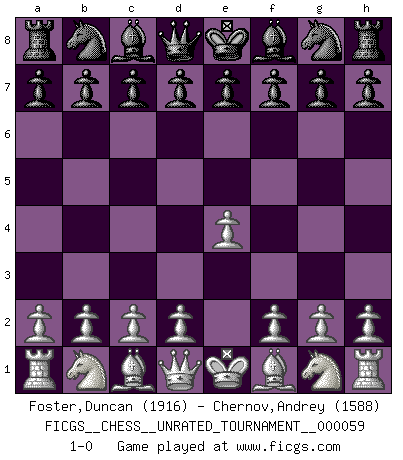 Last move : 1-0 2020 December 26 14:40:0 [Event "FICGS__CHESS__UNRATED_TOURNAMENT__000059"] [Site "FICGS"] [Date "2020.11.13"] [Round "1"] [White "Foster,Duncan"] [Black "Chernov,Andrey"] [Result "1-0"] [WhiteElo "1916"] [BlackElo "1588"] 1.e4 1-0 This chess game has been lost on time (started : 2020.11.13 20:7:17) King's pawn Opening Player White won this chess game. Follow this game move after move (download)Later, I began to succeed in decisive games. Perhaps because I realized a very simple truth: not only was I worried, but also my opponent. (Mikhail Tal) Wenn Schach ein enormer Dschungel ist, der seine Myriaden von Geheimnissen nicht preisgeben will, dann sind Computer die Kettensägen einer gewaltigen ökologisch unsensiblen Nutzholzfirma. (Nigel Short) El Ajedrez era la lengua materna de Capablanca. (Reti) Shah mat. Le roi est mort. Cri de fierté d'un joueur venant de terrasser son adversaire, courtoisement, sans effusion de sang. A journey of a thousand sites begins with a single click. (Author unknown)