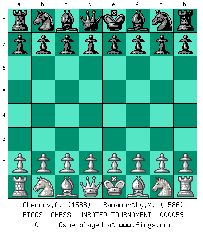 Last move : 0-1 2020 December 23 23:33:44 [Event "FICGS__CHESS__UNRATED_TOURNAMENT__000059"] [Site "FICGS"] [Date "2020.11.13"] [Round "1"] [White "Chernov,Andrey"] [Black "Ramamurthy,Murali"] [Result "0-1"] [WhiteElo "1588"] [BlackElo "1586"] 0-1 This chess game has been lost on time (started : 2020.11.13 20:7:17) Player Black won this chess game. Follow this game move after move (download)Excellence at Chess is one mark of a scheming mind. (Sir Arthur Conan Doyle) Wenn Du nicht kämpfst, um anderen etwas zu beweisen, sondern nur für Dich selbst, dann bist du fast unbesiegbar. (Garry Kasparov) Cuando tengas duda... ¡juega al Ajedrez!. (Tevis) Les échecs sont utiles à l'exercice de la faculté de penser et à celle de l'imagination. Car nous devons posséder une méthode élaborée pour atteindre des buts partout où nous devons conduire notre raison. (Leibnitz) Before all elsed, be armed. (Niccolo Machiavelli)