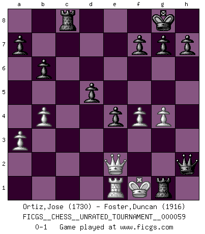 Last move : 0-1 2021 June 5 18:25:3 [Event "FICGS__CHESS__UNRATED_TOURNAMENT__000059"] [Site "FICGS"] [Date "2020.11.13"] [Round "1"] [White "Ortiz,Jose"] [Black "Foster,Duncan"] [Result "0-1"] [WhiteElo "1730"] [BlackElo "1916"] 1.e4 c6 2.Nf3 d5 3.e5 Bg4 4.Be2 e6 5.h3 Bxf3 6.Bxf3 Qc7 7.d4 c5 8.Be3 cxd4 9.Bxd4 Bc5 10.c3 Ne7 11.Qe2 Bxd4 12.O-O O-O 13.cxd4 Nec6 14.Rd1 Nd7 15.Nc3 Qb6 16.Na4 Qb4 17.b3 Nxd4 18.Rxd4 Qxd4 19.Rc1 Nxe5 20.Rd1 Nxf3+ 21.Qxf3 Qe5 22.Nc5 Qd6 23.b4 b6 24.Nd3 Rac8 25.a3 Rc3 26.Ra1 e5 27.Qd1 e4 28.Qd2 Rxd3 29.Qe2 Rc8 30.f3 Qg6 31.f4 Rxh3 32.g4 Qh6 33.Re1 Rg3+ 34.Kf2 Qh2+ 35.Kf1 Rg1+ 0-1 Caro-Kann defense Kingside Castling by player White (move 12) Kingside Castling by player Black (move 12) Player Black won this chess game. Follow this game move after move (download)In blitz, the Knight is stronger than the Bishop. (Vlastimil Hort) Korrekt heißt in Deutschland die Haltung eines Mannes, dessen Benehmen nach dem Urteile seiner Nachbarn seiner Stellung angemessen ist. Um korrekt zu sein, muß man sich der Meinung der anderen anpassen... (Emanuel Lasker) El juego de Fischer siempre fue nítido, racional y brillante. Uno de los mejores por siempre. (Dave Regis) Le moment que je préfère le plus dans une rencontre, c'est celui où je sens que la personnalité de l'adversaire se brise. (Robert Fischer) It's not the size of the dog in the fight, it's the size of the fight in the dog. (Mark Twain)