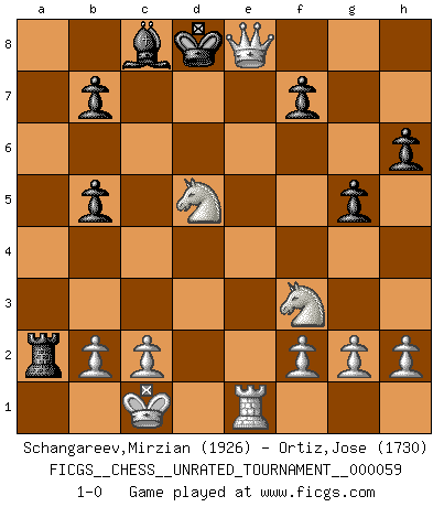 Last move : 1-0 2020 December 11 3:45:54 [Event "FICGS__CHESS__UNRATED_TOURNAMENT__000059"] [Site "FICGS"] [Date "2020.11.13"] [Round "1"] [White "Schangareev,Mirzian"] [Black "Ortiz,Jose"] [Result "1-0"] [WhiteElo "1926"] [BlackElo "1730"] 1.e4 c5 2.Nf3 Nc6 3.Nc3 e6 4.d4 d6 5.d5 exd5 6.exd5 Nce7 7.Qe2 h6 8.Bf4 g5 9.Qb5+ Qd7 10.Bxd6 a6 11.Qxc5 Nxd5 12.Bxf8 Ngf6 13.O-O-O Rxf8 14.Bb5 axb5 15.Rhe1+ Kd8 16.Rxd5 Nxd5 17.Nxd5 Rxa2 18.Qxf8+ Qe8 19.Qxe8+ 1-0 Sicilian defense Queenside Castling by player White (move 13) Player White won this chess game. Follow this game move after move (download)Chess is the art of analysis. (Mikhail Botvinnik) Sitze auf Deine Hände. (Siegbert Tarrasch) El Ajedrez es en su esencia, un juego. En su forma, un arte. Y en su ejecución, una ciencia. (Baron Tassilo) Karpov est une pièce de musée. (Garry Kasparov) At work, the authority of a person is inversely proportional to the number of pens that person is carrying. (Dan Rotaru)