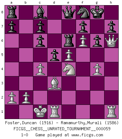Last move : 1-0 2021 February 19 17:25:47 [Event "FICGS__CHESS__UNRATED_TOURNAMENT__000059"] [Site "FICGS"] [Date "2020.11.13"] [Round "1"] [White "Foster,Duncan"] [Black "Ramamurthy,Murali"] [Result "1-0"] [WhiteElo "1916"] [BlackElo "1586"] 1.e4 e5 2.Nf3 Nc6 3.d4 exd4 4.Nxd4 Nf6 5.Nxc6 bxc6 6.e5 Nd5 7.c4 Bb4+ 8.Bd2 Bxd2+ 9.Qxd2 Ne7 10.Nc3 O-O 11.O-O-O Ng6 12.f4 Re8 13.h4 Nxh4 14.g4 Ng6 15.Qh2 Nf8 16.Bd3 g6 17.Ne4 Re6 18.f5 d5 19.f6 Qe8 20.Qh6 1-0 Scotch : Mieses variation Kingside Castling by player Black (move 10) Queenside Castling by player White (move 11) Player White won this chess game. Follow this game move after move (download)Via the squares on the chessboard, the Indians explain the movement of time and the age, the higher influences which control the world and the ties which link Chess with the human soul. (Al-Masudi) Es ist besser die Steine des Gegners zu opfern. (Savielly Grigorievitsch Tartakower) Las combinaciones han sido siempre el aspecto más intrigante del Ajedrez. Los Maestros las buscan, el público las aplauden, los críticos las alaban. La razón se debe a que las combinaciones hacen posible que el Ajedrez sea más que un ejercicio matemático con una carencia de vida. Ellas son la poesía del juego, son del Ajedrez lo que la melodía es de la música. Ellas representan el triunfo de la mente sobre la materia. (Reuben Fine) Donnez-moi un Cavalier en 6e et je gagnerais toutes mes parties. (Steinitz) The faster the computer, the slower the brain. (Thibault de Vassal)
