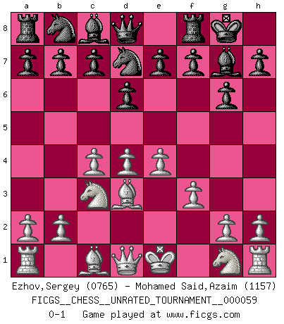 Last move : 0-1 2020 December 26 14:40:0 [Event "FICGS__CHESS__UNRATED_TOURNAMENT__000059"] [Site "FICGS"] [Date "2020.11.13"] [Round "1"] [White "Ezhov,Sergey"] [Black "Mohamed Said,Azaim"] [Result "0-1"] [WhiteElo "0765"] [BlackElo "1157"] 1.d4 Nf6 2.c4 g6 3.Nc3 Bg7 4.e4 d6 5.f3 O-O 6.Bd3 Nfd7 0-1 This chess game has been lost on time (started : 2020.11.13 20:7:17) King's Indian : Saemisch, 5...O-O Kingside Castling by player Black (move 5) Player Black won this chess game. Follow this game move after move (download)In Chess, as it is played by masters, chance is practically eliminated. (Emanuel Lasker) In Buenos Aires ist es nicht mein vorrangiges Ziel ein starkes Turnier zu organisieren, sondern ein Turnier für Gentlemen. Ich würde nie Kamsky einladen. Ich mag keine Probleme. (Miguel Najdorf) No nos podemos resistir a la fascinación de un sacrificio ya que la pasión por los sacrificios es parte de la naturaleza de un jugador de Ajedrez. (Rudolf Spielman) Comme les marins qui ont mille raisons différentes d'aller en mer, les joueurs d'échecs en ont tout autant avant de s'installer devant une table et jouer... (Vincent Bertignac, philosophe) He who fights with monsters should be careful lest he thereby become a monster. (Friedrich Nietzsche, Beyond Good and Evil)