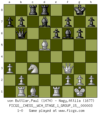Last move : 1-0 2007 October 1 4:50:56 [Event "FICGS__CHESS__WCH_STAGE_1_GROUP_15__000003"] [Site "FICGS"] [Date "2007.07.11"] [Round "1"] [White "von Buttlar,Paul"] [Black "Nagy,Attila"] [Result "1-0"] [WhiteElo "1474"] [BlackElo "1677"] 1.c4 c5 2.Nc3 Nf6 3.Nf3 e6 4.d4 d5 5.cxd5 Nxd5 6.e3 Nc6 7.Bd3 Be7 8.O-O O-O 9.a3 cxd4 10.exd4 Qb6 11.Bc2 g6 12.Ne4 Bd7 13.Re1 Rfd8 14.Rb1 Rac8 15.Nc3 Bf6 16.Be4 Nxd4 17.Bxd5 Nxf3+ 18.Qxf3 1-0 This chess game has been lost on time (started : 2007.07.11 17:17:11) English : Symmetrical variation Kingside Castling by player White (move 8) Kingside Castling by player Black (move 8) Player White won this chess game. Follow this game move after move (download)To avoid losing a piece, many a person has lost the game. (Savielly Tartakover) Ich tröste mich mit dem Vergnügen, daß Schachfans, Zuschauer und Leser glücklich sind, wenn ein Großmeister etwas riskiert, statt nur Klötzchen zu schieben. (Mikhail Nekhemyevich Tal) Un jugador que trata de regresar una movida en el Ajedrez es un futuro carterista. (Richard Fenton) Si le désir cupide (et stupide) de gagner est une inépuisable source de souffrance, une combinaison brillante sur l'échiquier est une découverte : le coquelicot qui s'épanouit lorsque apparaît la Voie Lactée. (Arrabal) True nature is revealed in times of difficulty. (Chinese proverb)