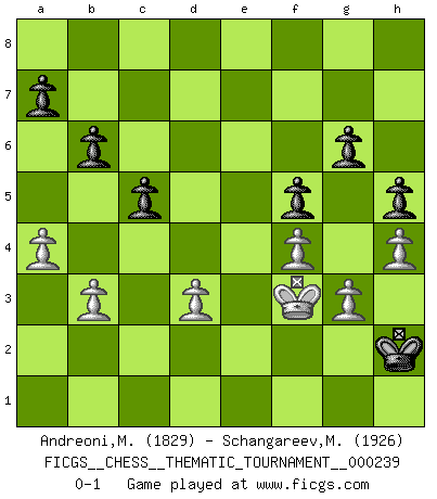 Last move : 0-1 2020 November 24 17:37:0 [Event "FICGS__CHESS__THEMATIC_TOURNAMENT__000239"] [Site "FICGS"] [Date "2020.11.13"] [Round "1"] [White "Andreoni,Mario"] [Black "Schangareev,Mirzian"] [Result "0-1"] [WhiteElo "1829"] [BlackElo "1926"] 1.c4 Nf6 2.Nc3 c5 3.g3 d5 4.cxd5 Nxd5 5.Bg2 Nc7 6.Nf3 Nc6 7.d3 e5 8.O-O Be7 9.Be3 O-O 10.Na4 b6 11.Rc1 Rb8 12.h4 Be6 13.a3 Nd4 14.Nc3 f6 15.Bxd4 exd4 16.Ne4 f5 17.Neg5 Bd5 18.Nh3 Ne6 19.e3 dxe3 20.fxe3 Bf6 21.Qc2 Qd6 22.Nf4 Nxf4 23.exf4 g6 24.Rfe1 Rbd8 25.Rcd1 Rfe8 26.Rxe8+ Rxe8 27.Re1 Rxe1+ 28.Nxe1 Kg7 29.Bxd5 Qxd5 30.b3 Qd4+ 31.Kf1 Qd5 32.Kg1 Qd4+ 33.Kf1 Qe3 34.Qf2 Qc1 35.a4 Bc3 36.Qe2 Kh6 37.Qe7 Qxe1+ 38.Qxe1 Bxe1 39.Kxe1 Kh5 40.Ke2 Kg4 41.Kf2 h6 42.Kg2 h5 43.Kf2 Kh3 44.Kf3 Kh2 0-1 English Opening Kingside Castling by player White (move 8) Kingside Castling by player Black (move 9) Player Black won this chess game. Follow this game move after move (download)I'd rather have a Pawn than a finger. (Reuben Fine) Ich habe die besten Aussichten, den ersten Preis zu gewinnen - denn jeder muss gegen Steinitz spielen, nur ich nicht! (Wilhelm Steinitz) En la perfecta combinación de Ajedrez como en una historia corta de primera clase, toda la trama y contra trama deberá conducir hacia un final sorprendente, el interes no es mitigado hasta el último momento. (Yates and Winter) Tous ces prétendus hommes politiques sont les pions, les Cavaliers, les Tours ou les Fous d'une partie d'échecs qui se jouera tant qu'un hasard ne renversera pas l'échiquier. (Honoré de Balzac) Luck is the residue of design. (John Milton)