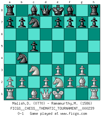 Last move : 0-1 2020 December 24 12:5:42 [Event "FICGS__CHESS__THEMATIC_TOURNAMENT__000239"] [Site "FICGS"] [Date "2020.11.13"] [Round "1"] [White "Malish,Dmitriy"] [Black "Ramamurthy,Murali"] [Result "0-1"] [WhiteElo "0770"] [BlackElo "1586"] 1.c4 Nf6 2.Nc3 c5 3.g3 d5 4.cxd5 Nxd5 5.Bg2 Nc7 6.e3 Nc6 7.Nge2 Nb4 0-1 This chess game has been lost on time (started : 2020.11.13 20:19:48) English Opening Player Black won this chess game. Follow this game move after move (download)Chess is a beautiful mistress. (Bent Larsen) Woher wissen wir, daß der Neanderthaler Blindschach gespielt hat? -- Bei Ausgrabungen wurden keine Schachbretter und Figuren gefunden. (Anonymous) Durante una competencia de Ajedrez, un Maestro de Ajedrez deberá ser una combinación de presa de caza y un Monge. (Alexander Alekhine) Si je n'étais pas joueur d'échecs, je serais le meilleur dans quelque chose d'autre. (Anatoli Karpov) I'm extremely disappointed. I send you out for exciting, new designer drugs, you come back with tomato sauce. (Gregory House, House M.D.)