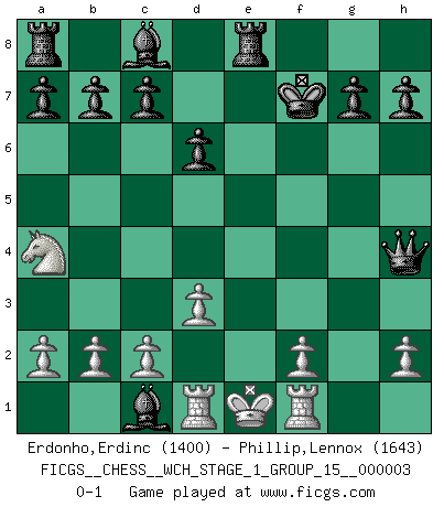 Last move : 0-1 2007 August 28 11:59:15 [Event "FICGS__CHESS__WCH_STAGE_1_GROUP_15__000003"] [Site "FICGS"] [Date "2007.07.11"] [Round "1"] [White "Erdonho,Erdinc"] [Black "Phillip,Lennox"] [Result "0-1"] [WhiteElo "1400"] [BlackElo "1643"] 1.e4 e5 2.Qf3 Nc6 3.Bc4 Nf6 4.g4 Nd4 5.g5 Nxf3+ 6.Nxf3 Nxe4 7.Nxe5 Nxg5 8.Nxf7 Nxf7 9.Nc3 Qh4 10.Bxf7+ Kxf7 11.Rf1 Bc5 12.d3 d6 13.Na4 Re8+ 14.Be3 Bxe3 15.Rd1 Bc1 0-1 This chess game has been lost on time (started : 2007.07.11 17:17:11) Variation Napoleon's Opening : Napoleon's Opening Player Black won this chess game. Follow this game move after move (download)My God, Bobby Fischer plays so simply. (Alexei Suetin) Bobby Fischer ist kein Vorbild für die heutige Jugend. (Viktor Kortschnoi) Robert Fischer es la ley hacia si mismo. (Larry Evans) Les pièces de l'échiquier étaient impitoyables. Elles le retenaient, elles l'absorbaient. Il y avait de l'horreur en cela, mais aussi une harmonie unique. Car, qu'y a-t-il dans le monde, à part les échecs ? (V. Nabokov) When you stop learning you start dying. (Scott Adams)