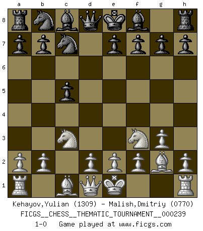 Last move : 1-0 2020 December 25 0:5:22 [Event "FICGS__CHESS__THEMATIC_TOURNAMENT__000239"] [Site "FICGS"] [Date "2020.11.13"] [Round "1"] [White "Kehayov,Yulian"] [Black "Malish,Dmitriy"] [Result "1-0"] [WhiteElo "1309"] [BlackElo "0770"] 1.c4 Nf6 2.Nc3 c5 3.g3 d5 4.cxd5 Nxd5 5.Bg2 Nc7 6.Nf3 1-0 This chess game has been lost on time (started : 2020.11.13 20:19:48) English Opening Player White won this chess game. Follow this game move after move (download)Chess is the art of analysis. (Mikhail Botvinnik) Wenn ein Kopf und ein Buch zusammenstoßen und es klingt hohl, ist es denn allemal im Buche? (Georg Christoph Lichtenberg) Ser exitoso en el Ajedrez te permite descubrir tu propia personalidad. Eso es lo que deseo para los niños de mi clase. (Saudin Robovic) La guerre est enfant de la passion, la passion est enfant du narcissisme et le narcissisme est l'enfant. (...) Une autre partie ? (Thibault de Vassal) There is a very easy way to return from a casino with a small fortune : go there with a large one. (Jack Yelton)