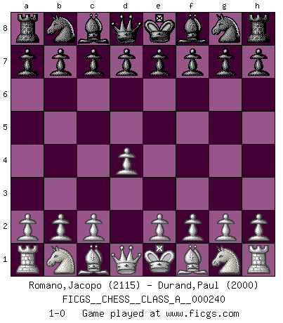 Last move : 1-0 2021 January 7 0:41:3 [Event "FICGS__CHESS__CLASS_A__000240"] [Site "FICGS"] [Date "2020.11.15"] [Round "1"] [White "Romano,Jacopo"] [Black "Durand,Paul"] [Result "1-0"] [WhiteElo "2115"] [BlackElo "2000"] 1.d4 1-0 This chess game has been lost on time (started : 2020.11.15 12:26:27) Queen's pawn Player White won this chess game. Follow this game move after move (download)We must make sure that Chess will not be like a dead language, very interesting, but for a very small group. (Sytze Faber) Schach ist mein Leben, meine Leidenschaft, was ich gelernt habe und seit meinem 14. Lebensjahr profimässig praktiziere. Darauf zu verzichten, würde mir sehr schwer fallen. (Viktor Kortschnoi) Nos gusta pensar. (Gary Kasparov) D'abord les bases : Jouez et étudiez, puis étudiez et jouez, ensuite jouez et étudiez, puis étudiez et jouez. Deuxièmement : Donnez toujours le meilleur de vous-même ! (Ken Smith) I know the human being and fish can coexist peacefully. (George W. Bush, Saginaw sept. 29, 2000)