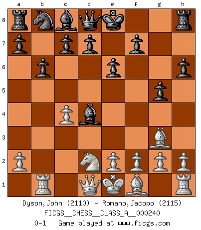 Last move : 0-1 2020 December 11 17:5:40 [Event "FICGS__CHESS__CLASS_A__000240"] [Site "FICGS"] [Date "2020.11.15"] [Round "1"] [White "Dyson,John"] [Black "Romano,Jacopo"] [Result "0-1"] [WhiteElo "2110"] [BlackElo "2115"] 1.Nf3 Nf6 2.c4 b6 3.d4 e6 4.Nc3 Bb4 5.Bg5 h6 6.Bh4 g5 7.Bg3 Ne4 8.Nd2 Nxc3 9.bxc3 Bxc3 10.Rb1 Bxd4 0-1 Reti Opening Player Black won this chess game. Follow this game move after move (download)A bad plan is better than none at all. (Frank Marshall) Alles was am Schachbrett zählt sind gute Züge. (Robert James Fischer) Tu no necesitas jugar muy bien, únicamente ayudar a tu oponenet a que juegue muy mal. (Genrikh Chepukaitis) Les Echecs sont et restent toujours un combat, un combat intégral comme la boxe, la lutte ou un autre sport, et où il doit y avoir un vainqueur et un vaincu. (Joseph Emil Diemer) Statistics can be made to prove anything - even the truth. (Author unknown)