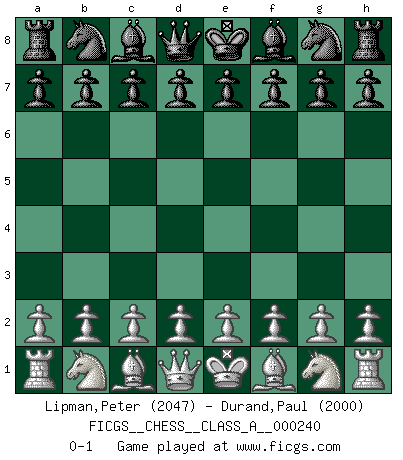 Last move : 0-1 2020 December 25 12:56:50 [Event "FICGS__CHESS__CLASS_A__000240"] [Site "FICGS"] [Date "2020.11.15"] [Round "1"] [White "Lipman,Peter"] [Black "Durand,Paul"] [Result "0-1"] [WhiteElo "2047"] [BlackElo "2000"] 0-1 This chess game has been lost on time (started : 2020.11.15 12:26:27) Player Black won this chess game. Follow this game move after move (download)Pawns are born free, yet they are everywhere in chains. (Rick Kennedy) Kasparov ist eine Art Monster mit hundert Augen, denen auch nicht das Geringste entgeht. (Tony Miles) Botvinnik trataba de restarle el misterio al Ajedrez, siempre relacionandolo a situaciones de la vida ordinaria. El gustaba de llamar al Ajedrez un típico problema inexacto similar a aquellos de los cuales la gente siempre tiene que enfrentarse en la vida cotidiana. (Garry Kasparov) J'ai vu le vaincu d'Echecs jouer des années durant dans l'espoir de la fête de la victoire. Car tu es plus riche de ce qu'elle existe si même elle n'est point pour toi. Ainsi de la perle du fond des mers. (Antoine de Saint-Exupéry) Those parts of the system that you can hit with a hammer (not advised) are called hardware; those program instructions that you can only curse at are called software. (Anonymous)