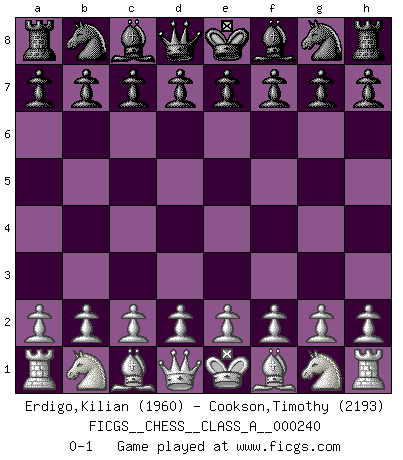 Last move : 0-1 2020 December 25 12:56:50 [Event "FICGS__CHESS__CLASS_A__000240"] [Site "FICGS"] [Date "2020.11.15"] [Round "1"] [White "Erdigo,Kilian"] [Black "Cookson,Timothy"] [Result "0-1"] [WhiteElo "1960"] [BlackElo "2193"] 0-1 This chess game has been lost on time (started : 2020.11.15 12:26:27) Player Black won this chess game. Follow this game move after move (download)Bobby is the finest Chess player this country ever produced. His memory for the moves, his brilliance in dreaming up combinations, and his fierce determination to win are uncanny. (John Collins) Die westlichen Werte sind eine Sprache, welche die Putin-Administration nicht versteht. (Garry Kasparov) Yo jugué Ajedrez con el y a veces le pude haber ganado solo que siempre devuelve su última jugada y juega la partida de manera diferente. (Mark Twain) Les Echecs mettent en conflit, non pas deux intelligences, mais deux volontés. (Lasker) If we knew what we were doing, we would not call it research. (Albert Einstein)