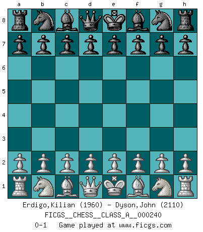 Last move : 0-1 2020 December 25 12:56:50 [Event "FICGS__CHESS__CLASS_A__000240"] [Site "FICGS"] [Date "2020.11.15"] [Round "1"] [White "Erdigo,Kilian"] [Black "Dyson,John"] [Result "0-1"] [WhiteElo "1960"] [BlackElo "2110"] 0-1 This chess game has been lost on time (started : 2020.11.15 12:26:27) Player Black won this chess game. Follow this game move after move (download)Chess is like war on a board. (Bobby Fischer) Du kannst im Schach nur gut werden, wenn du das Spiel liebst. (Robert James Fischer) El jugador blanco perdió porque fallo en recordar la coreccta continuación y tuvo que pensar por sí mismo las movidas. (Siegbert Tarrasch) Le plus grand jeu de l'esprit jamais inventé, plus vous l'apprenez, plus vous y prenez du plaisir. (Garry Kasparov) You cannot beat a roulette table unless you steal money from it. (Albert Einstein)