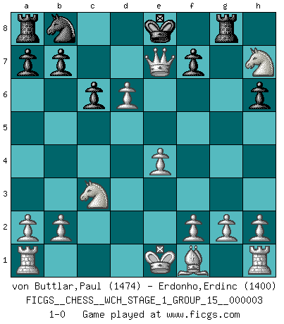 Last move : 1-0 2007 August 27 17:51:28 [Event "FICGS__CHESS__WCH_STAGE_1_GROUP_15__000003"] [Site "FICGS"] [Date "2007.07.11"] [Round "1"] [White "von Buttlar,Paul"] [Black "Erdonho,Erdinc"] [Result "1-0"] [WhiteElo "1474"] [BlackElo "1400"] 1.c4 e5 2.Nc3 Bc5 3.Nf3 Nh6 4.Nxe5 Rf8 5.d4 Bxd4 6.Qxd4 c6 7.c5 d5 8.cxd6 Bf5 9.e4 Bg4 10.Bxh6 gxh6 11.Nxg4 Rg8 12.Nf6+ Kf8 13.Nxh7+ Ke8 14.Qe5+ Qe7 15.Qxe7+ 1-0 This chess game has been lost on time (started : 2007.07.11 17:17:11) English Opening Player White won this chess game. Follow this game move after move (download)I like to say that Bobby Fischer was the greatest player ever. But what made Fischer a genius was his ability to blend an American freshness and pragmatism with Russian ideas about strategy. (Bruce Pandolfini) Vom Schach wurde gesagt das Leben sei dafür nicht lange genug. Aber das ist der Fehler des Lebens, nicht des Schach'. (Irving Chernev) Alekhine es un poeta que crea un trabajo de arte de algo que raramente inspiraría a otra persona a mandar una tarjeta postal. (Max Euwe) Le moment que je préfère le plus dans une rencontre, c'est celui où je sens que la personnalité de l'adversaire se brise. (Robert Fischer) The only difference between a tax man and a taxidermist is that the taxidermist leaves the skin. (Mark Twain)