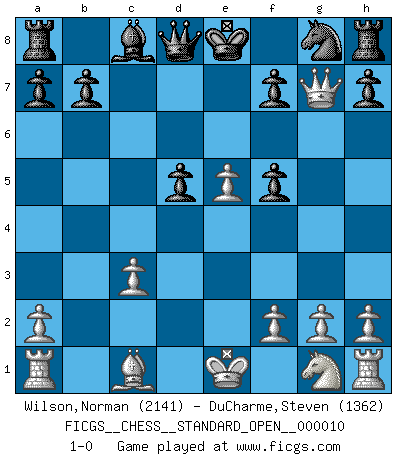 Last move : 1-0 2020 November 24 21:26:51 [Event "FICGS__CHESS__STANDARD_OPEN__000010"] [Site "FICGS"] [Date "2020.11.16"] [Round "1"] [White "Wilson,Norman"] [Black "DuCharme,Steven"] [Result "1-0"] [WhiteElo "2141"] [BlackElo "1362"] 1.e4 c5 2.c3 e6 3.d4 d5 4.e5 cxd4 5.cxd4 Bb4+ 6.Nc3 Nc6 7.Bd3 Nxd4 8.Qg4 Bxc3+ 9.bxc3 Nf5 10.Bxf5 exf5 11.Qxg7 1-0 Sicilian : Alapin's variation (2.c3) Player White won this chess game. Follow this game move after move (download)The tactician knows what to do when there is something to do; whereas the strategian knows what to do when there is nothing to do. (Gerald Abrahams) Mit sehr nachdenklichem Gesicht schreitet Bobby durch den Turniersaal. Was ist passiert?, fragt Lombardy. Ich stehe schlecht, antwortet Fischer. Lombardy: Dann biete doch einfach Remis an. Fischer: So schlecht stehe ich nun auch wieder nicht! (Robert James Fischer) No volvere nunca a jugar contigo. Has insultado a mi amigo. - cuando un oponente se maldijo por una mala jugada (Miguel Najdorf) Ne tendez aucun piège pour le plaisir ! Ne jouez rien dans l'espoir que l'adversaire réagisse de façon stupide ! Prenez toujours pour acquis que l'adversaire va trouver le meilleur coup ! Ne jouez jamais de coup dans l'espoir que l'adversaire ne voie pas la menace ! Chacun de vos coups doit améliorer la position d'une façon ou d'une autre. You must have a dream in order to have it come true. (A.P.J. Kalam)