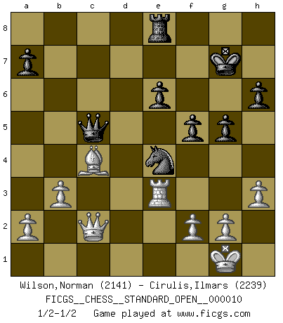 Last move : 1/2-1/2 2021 January 8 9:56:44 [Event "FICGS__CHESS__STANDARD_OPEN__000010"] [Site "FICGS"] [Date "2020.11.16"] [Round "1"] [White "Wilson,Norman"] [Black "Cirulis,Ilmars"] [Result "1/2-1/2"] [WhiteElo "2141"] [BlackElo "2239"] 1.d4 d5 2.c4 c6 3.Nc3 e6 4.e3 Nf6 5.Nf3 Nbd7 6.Qc2 Bd6 7.Be2 O-O 8.O-O Re8 9.b3 b6 10.Bb2 Bb7 11.Rad1 Qe7 12.Rfe1 Rad8 13.Bf1 Qf8 14.e4 dxe4 15.Nxe4 Nxe4 16.Rxe4 Nf6 17.Rh4 h6 18.Rd3 Nh7 19.c5 Be7 20.Rf4 g5 21.Rg4 Ba6 22.Ne5 f5 23.R4g3 bxc5 24.Nxc6 Rd5 25.Nxe7+ Qxe7 26.dxc5 Bxd3 27.Bxd3 Rxc5 28.Bc4 Nf6 29.Ba3 Kg7 30.h3 Qc7 31.Bxc5 Qxc5 32.Rc3 Ne4 33.Re3 1/2-1/2 QGD Slav defense Kingside Castling by player Black (move 7) Kingside Castling by player White (move 8) This chess game ended in a draw. Follow this game move after move (download)The Chess pieces are the block alphabet which shapes thoughts; and these thoughts, although making a visual design on the chessboard, express their beauty abstractly, like a poem. (Marcel Duchamp) Ich organisiere ein großes Turnier, was mich etwa 120000 Dollar kostet. Ich denke, das ist das erste Mal in der Schachgeschichte, daß ein Schachgroßmeister auch als Mäzen auftritt. (Miguel Najdorf) Si tu oponente te ofrece un empate, trata de averiguar porque piensa él que esta en una posición peor. (Nigel Short) Les échecs, c'est l'art d'analyser. (Mikhail Botvinnik) See no evil, hear no evil, speak no evil. (The 3 monkeys)