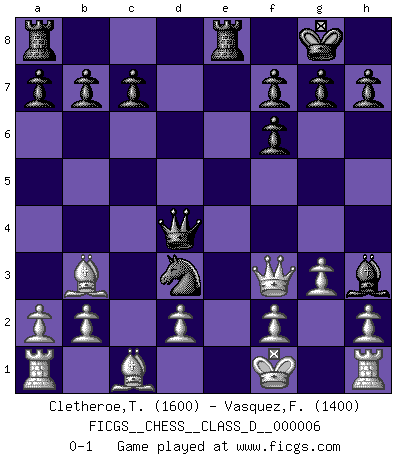 Last move : 0-1 2006 September 12 0:34:32 [Event "FICGS__CHESS__CLASS_D__000006"] [Site "FICGS"] [Date "2006.06.22"] [Round "1"] [White "Cletheroe,Timothy"] [Black "Vasquez,Fernando"] [Result "0-1"] [WhiteElo "1600"] [BlackElo "1400"] 1.Nc3 d5 2.e4 dxe4 3.Nxe4 Nf6 4.Nxf6+ exf6 5.Bc4 Nc6 6.Ne2 Bc5 7.c3 Ne5 8.Bb3 Nd3+ 9.Kf1 O-O 10.Nd4 Bxd4 11.cxd4 Qxd4 12.Qf3 Re8 13.g3 Bh3+ 0-1 Dunst (Sleipner, Heinrichsen) Opening Kingside Castling by player Black (move 9) Player Black won this chess game. Follow this game move after move (download)Some part of a mistake is always correct. (Savielly Tartakover) Die Auseinandersetzung mit Karpow war politisch geprägt. Er stand für das kommunistische System, wurde von dessen Repräsentanten gehätschelt. Ich war der Oppositionelle. Jeder Schachweltmeister spiegelt auch die gesellschaftlichen Verhältnisse wider. Kramnik steht für die Börsen-Generation des Neuen Markts, ideologiefrei, zahlenfixiert. (Garry Kasparov) Hay dos clases de hombres: aquellos que se conforman en dejarse llevar por las circunstancias y que juegan barajas y aquellos decididos a controlar las circunstancias y que juegan al Ajedrez. (Mortimer Collins) Les Echecs sont affaire de jugement sensible. Savoir quand frapper et quand esquiver. (Fischer) For peace of mind, resign as general manager of the universe. (Douglas Adams)
