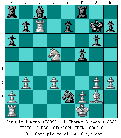 Last move : 1-0 2020 December 5 3:25:59 [Event "FICGS__CHESS__STANDARD_OPEN__000010"] [Site "FICGS"] [Date "2020.11.16"] [Round "1"] [White "Cirulis,Ilmars"] [Black "DuCharme,Steven"] [Result "1-0"] [WhiteElo "2239"] [BlackElo "1362"] 1.c4 f5 2.g3 Nf6 3.Bg2 c6 4.Nf3 d5 5.O-O g6 6.b3 Bg7 7.Bb2 O-O 8.d3 Ng4 9.Bxg7 Kxg7 10.Qc2 Qd6 11.cxd5 cxd5 12.Nc3 a6 13.h3 Ne5 14.Nxe5 Qxe5 15.Nxd5 Nc6 16.Rfc1 Nd4 17.Qc7 Nxe2+ 18.Kf1 Qxc7 19.Rxc7 1-0 English : Anglo-Dutch defense Kingside Castling by player White (move 5) Kingside Castling by player Black (move 7) Player White won this chess game. Follow this game move after move (download)In life, as in Chess, one's own Pawns block one's way. A man's very wealth, ease, leisure, children, books, which should help him to win, more often checkmate him. (Charles Buxton) Ich habe Putins Aufstieg an die Macht beobachtet und seine Politik, die demokratischen Institutionen meines Landes zu zerstören. (Garry Kasparov) Juega la Apertura como un libro, el Juego Medio como un mago y los Finales como una máquina. (Spielmann) Avec des compensations pour le matériel en plus... (Anonyme) Do you know these so called Volunteers don't even get paid! (Simpsons)