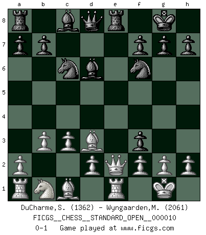 Last move : 0-1 2020 November 26 20:56:15 [Event "FICGS__CHESS__STANDARD_OPEN__000010"] [Site "FICGS"] [Date "2020.11.16"] [Round "1"] [White "DuCharme,Steven"] [Black "Wyngaarden,Martin"] [Result "0-1"] [WhiteElo "1362"] [BlackElo "2061"] 1.e4 e5 2.Nf3 Nf6 3.Bd3 d5 4.Qe2 Bd6 5.O-O O-O 6.exd5 c6 7.dxc6 Nxc6 8.c3 Re8 9.b3 e4 10.Re1 exf3 0-1 Petrov's defense Kingside Castling by player White (move 5) Kingside Castling by player Black (move 5) Player Black won this chess game. Follow this game move after move (download)Many Chess players were surprised when after the game, Fischer quietly explained: 'I had already analyzed this possibility' in a position which I thought was not possible to foresee from the opening. (Mikhail Tal) Ein Isolani verdüstert die Stimmung auf dem ganzen Schachbrett. (Savielly Grigorievitsch Tartakower) No hay un Gran Maestro de Ajedrez que sea normal; solo se diferencían ellos por la magnitud de su locura. (Viktor Korchnoi) Le jeu d'échecs est comme rejeté hors du temps. (Antoine de Saint-Exupéry) Plans are ideas that never come to fruition. (Daniel Parmet)