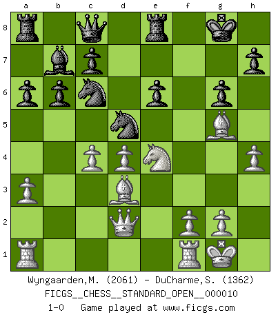 Last move : 1-0 2020 December 6 1:49:14 [Event "FICGS__CHESS__STANDARD_OPEN__000010"] [Site "FICGS"] [Date "2020.11.16"] [Round "2"] [White "Wyngaarden,Martin"] [Black "DuCharme,Steven"] [Result "1-0"] [WhiteElo "2061"] [BlackElo "1362"] 1.c4 Nf6 2.Nc3 d5 3.cxd5 Nxd5 4.Nf3 Nc6 5.e3 e6 6.d4 Bb4 7.Qc2 O-O 8.Bd3 g6 9.a3 Bxc3+ 10.bxc3 a6 11.e4 Nde7 12.O-O b6 13.Bh6 Re8 14.Qd2 Bb7 15.h4 f5 16.Ng5 fxe4 17.Nxe4 Nd5 18.Bg5 Qc8 19.c4 1-0 English : Anglo-Gruenfeld defense Kingside Castling by player Black (move 7) Kingside Castling by player White (move 12) Player White won this chess game. Follow this game move after move (download)A strong memory, concentration, imagination, and a strong will is required to become a great Chess player. (Bobby Fischer) Früher wurde jeder komplizierte Zug, jedes interessante Opfer mit großem Beifall und Enthusiasmus aufgenommen. Heute schaltet man einfach seinen Fritz an, und man kann sehen, was los ist, ob der Zug geht oder nicht. (Vladimir Kramnik) Bobby es el jugador de Ajedrez mas fino que este país jamás haya producido. Su memoria para las movidas, su brillantez en soñar combinaciones y su feróz determinación por la victoria son algo extraño. (John Collins) Les erreurs sont comme les malheurs, elles n'arrivent jamais seules. (Siegbert Tarrasch) Hello Thibault, if I have had a plan (and I had one, I hope), I have forgotten it during the last week... - Hello Heinz-Georg. What do you mean a plan ? (Anonymous players, during a Big Chess game)