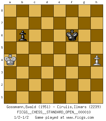Last move : 1/2-1/2 2021 January 22 18:5:26 [Event "FICGS__CHESS__STANDARD_OPEN__000010"] [Site "FICGS"] [Date "2020.11.16"] [Round "1"] [White "Gossmann,Ewald"] [Black "Cirulis,Ilmars"] [Result "1/2-1/2"] [WhiteElo "1951"] [BlackElo "2239"] 1.e4 e5 2.Nf3 Nc6 3.Bc4 Bc5 4.c3 Nf6 5.d4 exd4 6.O-O Nxe4 7.cxd4 d5 8.dxc5 dxc4 9.Qe2 Qe7 10.Qxc4 Bf5 11.Re1 O-O-O 12.Nc3 Rhe8 13.Bf4 Qe6 14.Qxe6+ Rxe6 15.Nb5 Nxc5 16.Bxc7 Rd5 17.Nc3 Rxe1+ 18.Rxe1 Rd7 19.Bg3 Be6 20.b3 h6 21.Nb5 Kd8 22.Bd6 Nd3 23.Rd1 Ndb4 24.Rd2 a6 25.Na7 Bg4 26.Nxc6+ Nxc6 27.Nd4 Rxd6 28.Nxc6+ Kc7 29.Nd4 Rd5 30.f3 Bd7 31.Kf2 Rh5 32.h3 a5 33.Ne2 Kc6 34.Nd4+ Kc7 35.a4 Kb6 36.Nc2 Be6 37.Nd4 Bd7 38.Nc2 Kc7 39.Nd4 g6 40.Ke3 Re5+ 41.Kd3 h5 42.h4 Kd6 43.Rd1 f6 44.g3 g5 45.Rc1 b6 46.f4 gxf4 47.gxf4 Rc5 48.Rc3 Rxc3+ 49.Kxc3 Kd5 50.Ne2 Ke4 51.Ng3+ Kxf4 52.Nxh5+ Ke5 53.Nxf6 Kxf6 54.b4 axb4+ 55.Kxb4 Bxa4 56.Kxa4 1/2-1/2 Giuoco Piano Kingside Castling by player White (move 6) Queenside Castling by player Black (move 11) 10 pieces endgame at move 52 : White KNPPP , Black KBPPP WHITE : King + 1 Knight 3 Pawns BLACK : King + 1 Bishop 3 Pawns 9 pieces endgame at move 53 : White KNPPP , Black KBPP WHITE : King + 1 Knight 3 Pawns BLACK : King + 1 Bishop 2 Pawns 8 pieces endgame at move 53 : White KPPP , Black KBPP WHITE : King + 3 Pawns BLACK : King + 1 Bishop 2 Pawns 7 pieces endgame at move 54 : White KPP , Black KBPP WHITE : King + 2 Pawns BLACK : King + 1 Bishop 2 Pawns 6 pieces endgame at move 55 : White KPP , Black KBP WHITE : King + 2 Pawns BLACK : King + 1 Bishop 1 Pawn 5 pieces endgame at move 55 : White KP , Black KBP WHITE : King + 1 Pawn BLACK : King + 1 Bishop 1 Pawn 4 pieces endgame at move 56 : White KP , Black KP WHITE : King + 1 Pawn BLACK : King + 1 Pawn This chess game ended in a draw. Follow this game move after move (download)Life is like a game of Chess, changing with each move. (Chinese proverb) Heutzutage gewinnt im Turnier nicht derjenige Spieler, der weitreichende Pläne entwirft, sondern einfach jener, der Zug um Zug kämpft. (David Bronstein) Si no le temes a Spassky, entonces elimino el elemento del dinero. (Jim Slater) Que feriez-vous si vous étiez en train de jouer aux échecs et que la fin du monde arrive ? Je continuerais à jouer. (Saint Borromée) CHESS, n. f. [echecs, Fr.] A nice and abstruse game, in which two sets of puppets are moved in opposition to each other. (Dr Samuel Johnson, A Dictionary Of The English Language, 1755)